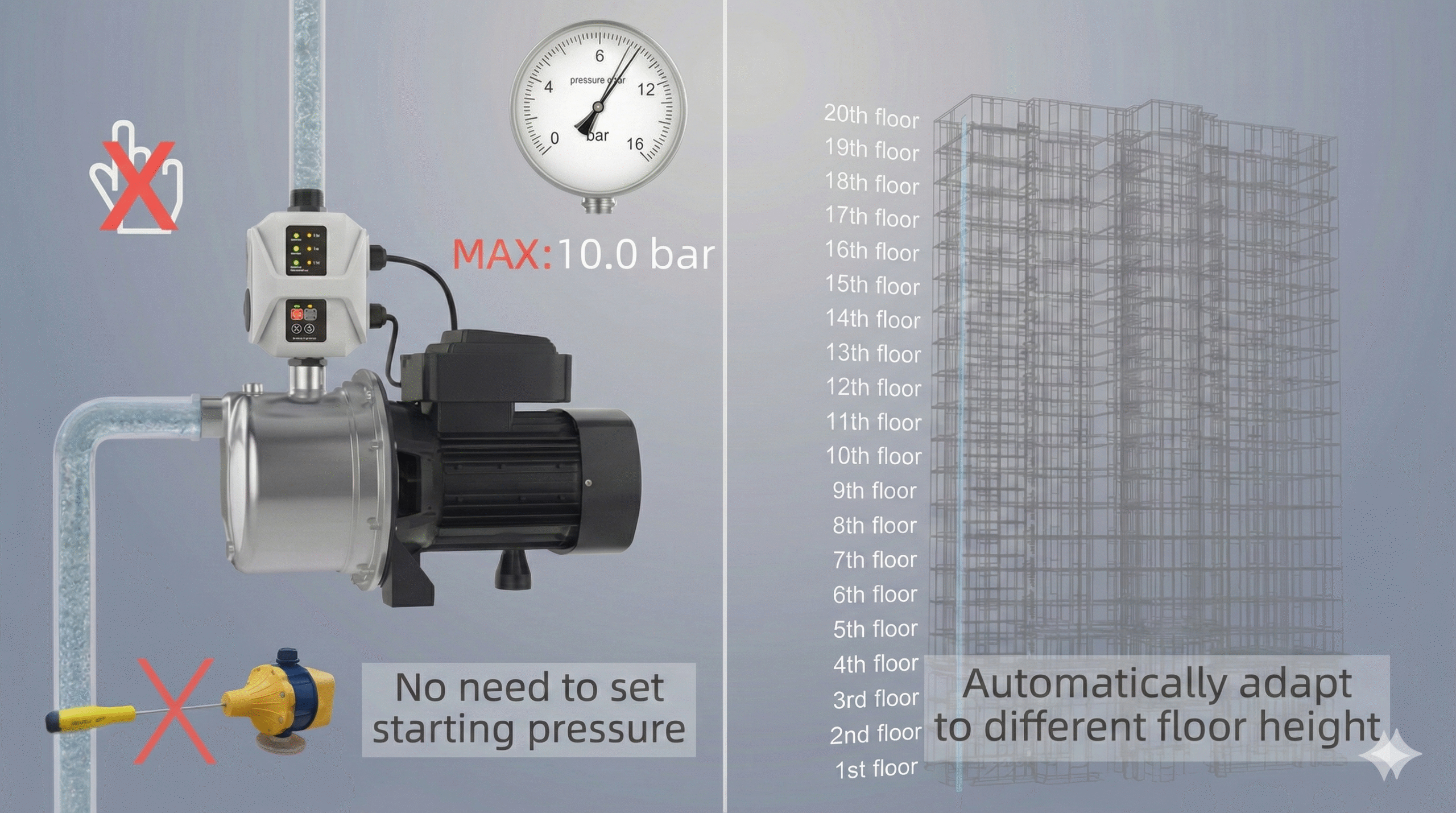Hungerät intelligent series automatic pump controllers are designed with a universal voltage range of 110V–240V and compatibility with both 50Hz and 60Hz power supplies. Suitable for all single-phase pumps up to 2.2KW, this all-in-one solution eliminates the need to stock multiple models based on different power ratings. Distributors can streamline their inventory and reduce complexity, while end users only need to choose whether they want additional features such as a pressure gauge or timer. A smarter, simpler choice that saves effort for sellers and brings peace of mind to buyers.
